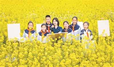春暖花開,江蘇省海安市教師發(fā)展中心附屬小學(xué)的老師帶著學(xué)生們來(lái)到油菜花田開展美術(shù)寫生活動(dòng),指導(dǎo)學(xué)生們用畫筆描繪美麗春色,感受春天的氣息。圖為3月31日,學(xué)生們?cè)谟筒嘶ㄌ镩g畫畫。
