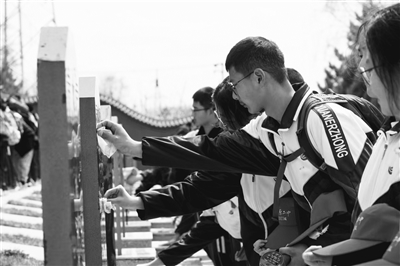 學(xué)生們來到墓碑前,小心翼翼地擦拭墓碑。