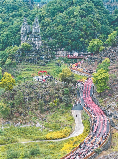 4月26日,省級(jí)非物質(zhì)文化遺產(chǎn)——興文苗族花山節(jié)傳承展示活動(dòng),在四川省宜賓市興文縣興文石海景區(qū)舉行?;顒?dòng)現(xiàn)場,苗族同胞身著節(jié)日盛裝,跳起蘆笙舞,參加巡游等傳統(tǒng)民俗表演,吸引眾多游客參與。 何海洋 攝