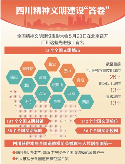攀枝花市、雅安市、巴中市、資陽市4個(gè)地級(jí)城市,簡陽市、北川羌族自治縣、樂至縣、峨眉山市、隆昌市、大竹縣、江安縣、西昌市、漢源縣9個(gè)縣級(jí)城市,共計(jì)13個(gè)城市入選第七屆全國文明城市……5月23日,全國精神文明建設(shè)表彰大會(huì)在北京召開,四川拿到了一份高分“答卷”。