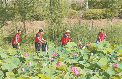 近年來,河南省汝陽縣對北汝河進行綜合治理并深入宣傳“綠水青山就是金山銀山”的理念,營造環(huán)境保護人人參與、文明行為人人踐行的濃厚氛圍。圖為6月4日,志愿者清理北汝河荷花池垃圾??导t軍 攝