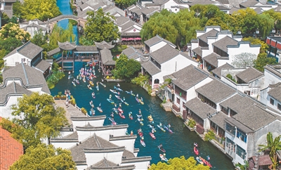 6月21日,2025年第七屆南潯古鎮(zhèn)槳板公開賽在浙江省湖州市南潯古鎮(zhèn)景區(qū)舉行,來自各地的眾多選手參與競技角逐。在粉墻黛瓦的江南古鎮(zhèn)小橋流水間奮力揮槳逐浪,上演“速度與激情”,呈現(xiàn)出一場精彩絕倫的水上運動盛會。計海新 攝