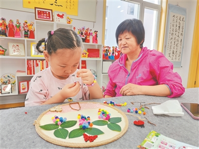 在太原玉園南社區(qū)“老幼共托”服務(wù)陣地,一位老人結(jié)束繪畫(huà)課程后,陪同孫子做手工。(玉園南社區(qū)供圖)