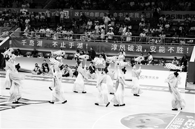7月20日,“浙BA”杭州預選賽西部賽區(qū),桐廬隊對陣淳安隊。圖為中場休息時,淳安帶來《魚躍千島》舞蹈,展現(xiàn)千島湖的水美魚豐。徐軍勇 攝