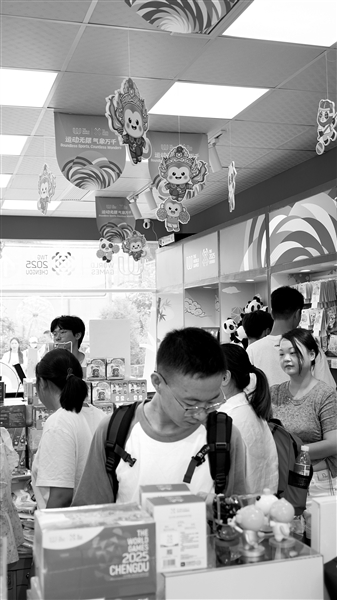 本報(bào)訊(冉曉龍 記者 趙青)8月6日上午,四川省成都市春熙路北段茂業(yè)百貨外的成都世運(yùn)會(huì)官方特許商品零售店內(nèi)人頭攢動(dòng)。距成都世運(yùn)會(huì)8月7日開(kāi)幕僅剩一天,這場(chǎng)始于7月7日的文創(chuàng)消費(fèi)熱潮持續(xù)升溫。