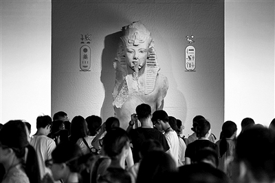 8月17日晚,上海博物館,觀眾在參觀圖坦卡蒙雕像。 朱偉輝 攝