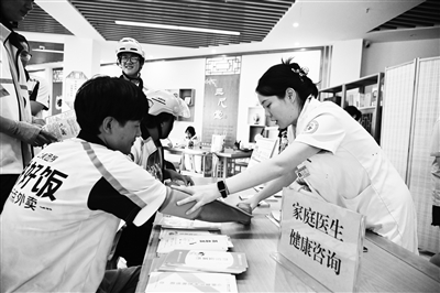 8月21日,重慶市沙坪壩區(qū)天星橋街道、天星橋社區(qū)衛(wèi)生服務(wù)中心聯(lián)合開(kāi)展新就業(yè)形態(tài)勞動(dòng)者“家庭醫(yī)生”服務(wù)簽約活動(dòng),活動(dòng)現(xiàn)場(chǎng)共有20名外賣(mài)員簽訂《家庭醫(yī)生簽約服務(wù)協(xié)議》。協(xié)議包括免費(fèi)健康評(píng)估、健康狀況監(jiān)測(cè)等服務(wù)內(nèi)容。此外,還為簽約外賣(mài)員免費(fèi)提供定期血壓、血糖檢測(cè)服務(wù),優(yōu)先預(yù)約轉(zhuǎn)診、就醫(yī)綠色通道等服務(wù)。圖為家庭醫(yī)生簽約團(tuán)隊(duì)的醫(yī)生為外賣(mài)員測(cè)量血壓。孫凱芳 攝