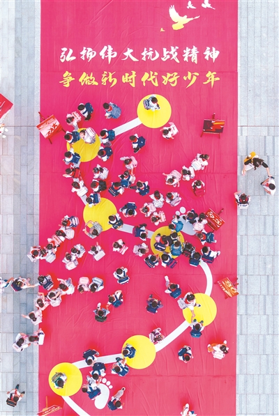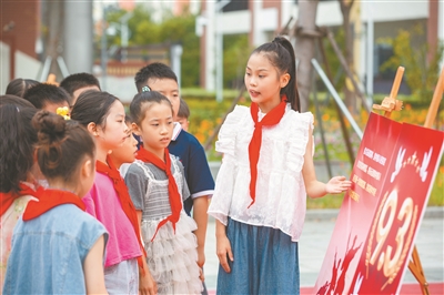 江蘇省海安高新區(qū)實驗小學將愛國主義教育融入“開學第一課”,通過抗戰(zhàn)海報展、主題班會等形式,引導學生銘記歷史、緬懷先烈,傳承弘揚偉大抗戰(zhàn)精神。圖為9月1日,學生在校園內(nèi)參觀“弘揚偉大抗戰(zhàn)精神”海報展。
