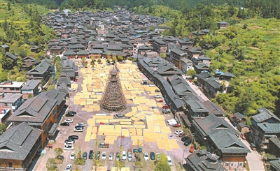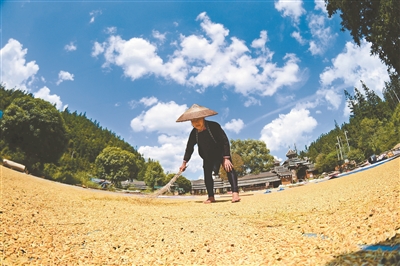 金秋時節(jié),貴州省黔東南苗族侗族自治州從江縣各村村民把收獲的稻谷等農(nóng)作物晾曬在房前屋后,處處都是豐收的景象,構(gòu)成一幅幅美麗的農(nóng)家“曬秋圖”。圖為9月15日,從江縣高增鄉(xiāng)小黃侗寨村民在鼓樓邊晾曬稻谷。石宏輝 攝