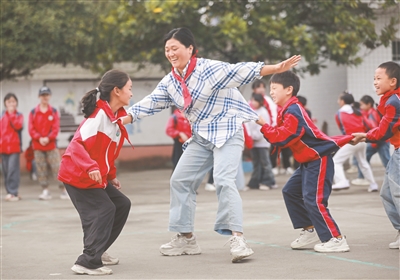 近年來(lái),貴州省黔西市綠化白族彝族鄉(xiāng)培育小學(xué)常態(tài)化開(kāi)展形式多樣、內(nèi)容豐富的“多彩大課間”活動(dòng),結(jié)合學(xué)生興趣與學(xué)校特色推出創(chuàng)新項(xiàng)目,著力打造健康、快樂(lè)、充滿活力的校園文化。圖為10月13日,老師帶領(lǐng)學(xué)生們?cè)诖笳n間玩老鷹捉小雞游戲。