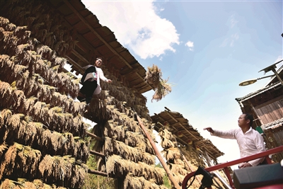 金秋時節(jié),貴州省黔東南苗族侗族自治州從江縣高增鄉(xiāng)占里村,侗族同胞將豐收的糯禾晾曬在禾晾架上,呈現(xiàn)出一幅豐收曬秋圖。圖為10月12日,占里村村民在晾曬糯禾。