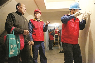 李永軍(左二)與同事們走進老舊小區(qū),更換樓道內(nèi)損壞的燈泡、開關(guān)等。