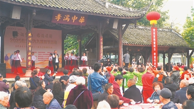 上午10點,“千叟宴”尚未開始,仁孝廣場上已經(jīng)熱鬧起來:“德孝”主題的文藝節(jié)目輪番上演,精彩紛呈;書畫志愿者現(xiàn)場創(chuàng)作蘊含“孝”意的書法作品贈予現(xiàn)場群眾;攝影志愿者為村民拍攝全家福,定格一張張幸福笑臉。而在廣場一側(cè)的新時代文明實踐陣地——邛崍市當代孝道文化博物館里,數(shù)十名學(xué)生認真抄寫《孝經(jīng)》,不少村民、游客在這里了解當代孝子的感人故事,傳承弘揚德孝文化。據(jù)介紹,當代孝道文化博物館自2014年重陽節(jié)創(chuàng)立以來,秉持“傳播孝道文化、促進社會和諧”的宗旨,以文字、圖片、影像、實物等形式集中展現(xiàn)當代孝子的感人故事,并免費開放。截至目前,累計接待游客70萬余人次。
