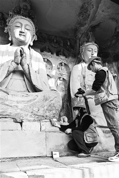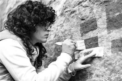 11月26日,四川省資陽市安岳縣毗盧洞石刻造像外圍的一處風化崖壁旁,意大利羅馬薩皮恩扎大學在讀博士娜塔莉·阿科皮諾,小心翼翼將她帶來的石質(zhì)文物加固材料涂刷在崖壁之上。一個月之后,她將再回現(xiàn)場,系統(tǒng)評估加固效果。
