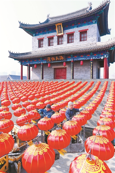 春節(jié)臨近,年味漸濃。2月2日,山東省青島市即墨古城張燈結(jié)彩,營造喜慶祥和的節(jié)日氛圍,迎接新春佳節(jié)的到來。圖為工人在即墨古城懸掛燈籠。梁孝鵬 攝