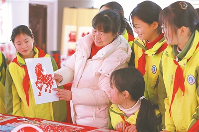 1月26日,湖北省竹山縣麻家渡鎮(zhèn)柿樹坪小學(xué)的教室里暖意融融。剪紙課教師謝琴悉心指導(dǎo)孩子們剪紅色窗花。清脆的剪紙聲在教室中響起,每一剪刀都藏著對新年的美好憧憬。圖為教師謝琴講解剪紙技巧。朱本雙   蔡春芳 攝