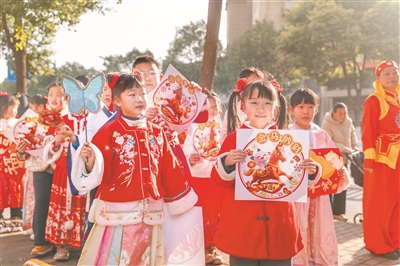 圖1:孩子們身穿漢服巡游。(南京江北新區(qū)葛塘街道新時(shí)代文明實(shí)踐所供圖)