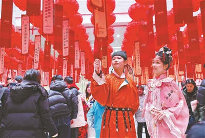 3月3日,河北省秦皇島博物館組織開展“秦博駿啟 元宵喜樂——博物館里鬧元宵”活動(dòng)。圖為游客在秦皇島博物館內(nèi)猜燈謎。曹建雄 攝